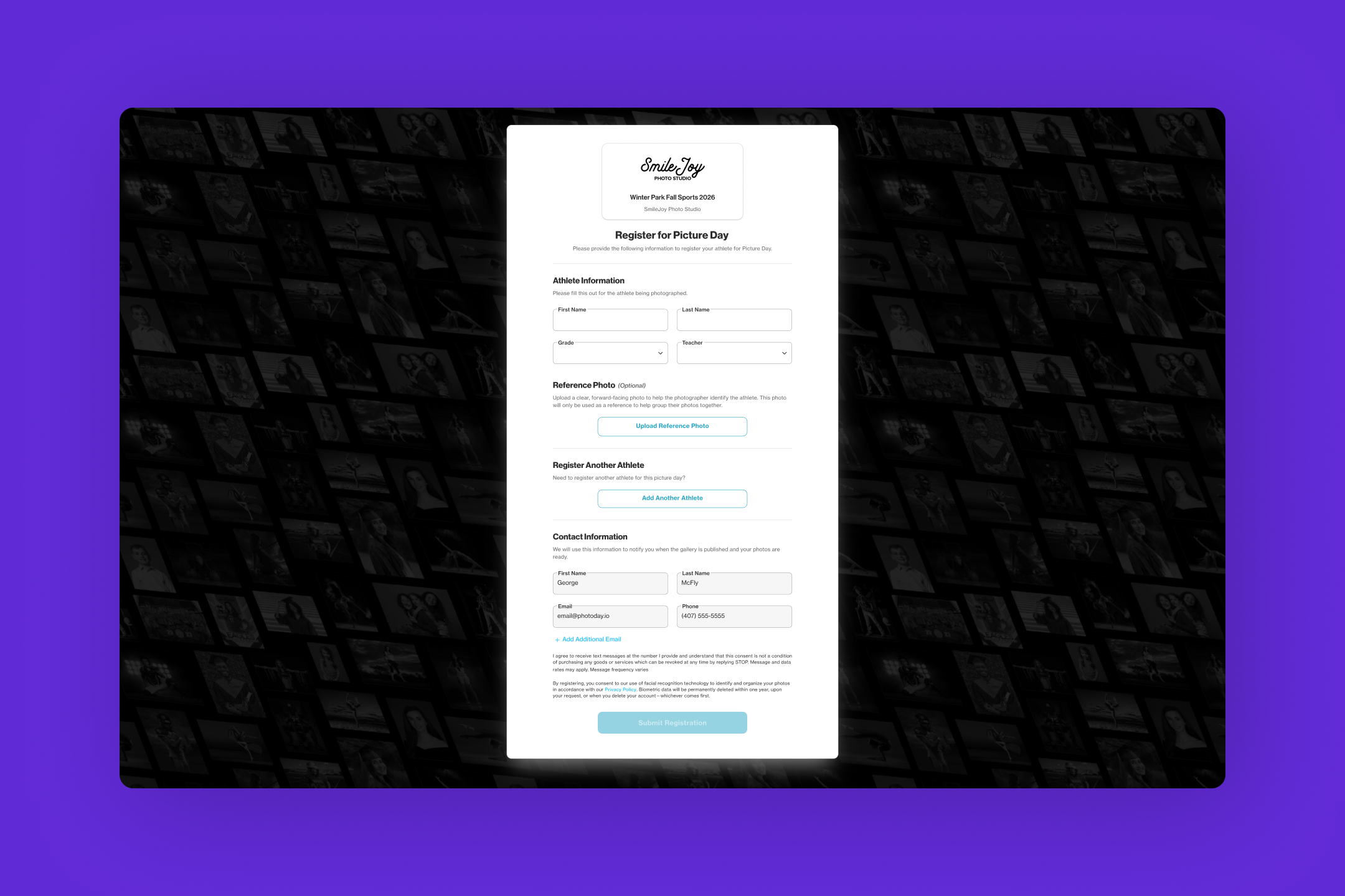 Our brand-new Registration Forms feature allows studios to share a custom form before picture day that creates and updates Subject records right within PhotoDay—without needing to collect data from the organization.